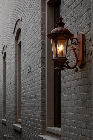 Three windows and a lamp adorn an old brick building in historic downtown Tarpon Springs Florida