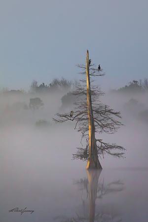 A Cypress tree emerges from the fog at daybreak in Lakeland Florida.
